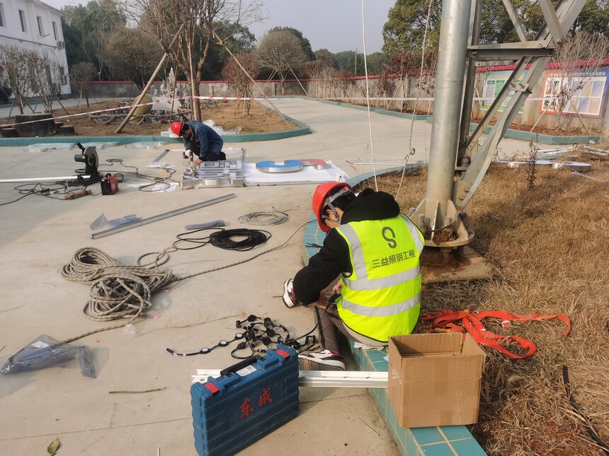 本次施式歷時(shí)20天,施工包括:鐵塔全彩燈光亮化,鐵塔園形網(wǎng)格屏,塔頂?shù)貥?biāo)光束燈。含強(qiáng)電施工、弱電施工、外墻燈具施工。